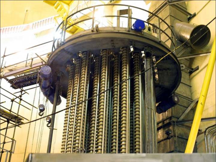 El corazón de la central son sus dos reactores: en sus vasijas se alojan 157 elementos combustibles (con uranio enriquecido al 4,5 por ciento) cargados en una estructura que alcanza los cuatro metros.