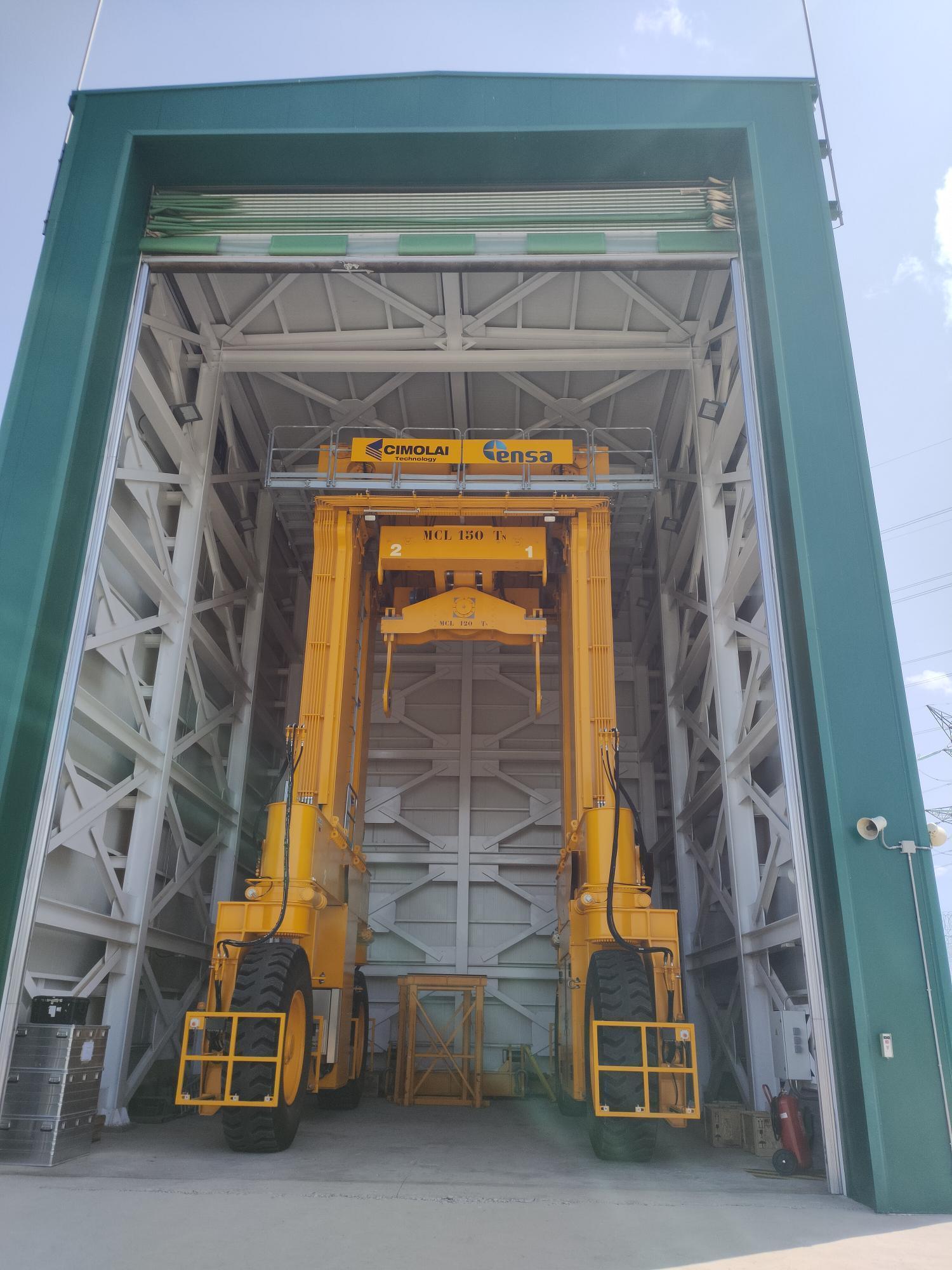 Los bidones salen tumbados del edificio de combustible y se levantan para colocarlos en su emplazamiento definitivo mediante esta enorme grúa.