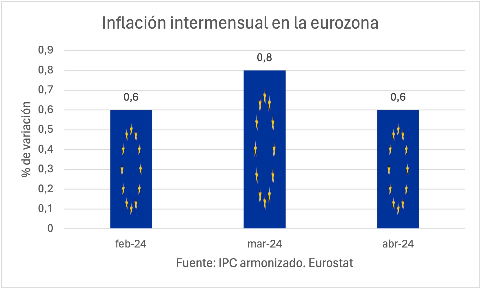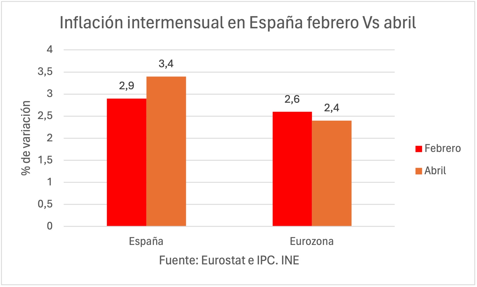Con los datos de abril definitivos, observamos cómo la inflación confirma lo ya apuntado en estas páginas hace un mes, referente a los datos de marzo, y no sólo sigue en unos niveles muy elevados, sino que repunta de manera importante. A niveles de la zona euro, aunque la inflación interanual ha pasado del 2,6% al 2,4%, el dato mensual se mantiene persistente en su fuerza de incremento de los precios, ya que creció un 0,6% en febrero, un 0,8% en marzo y un 0,6% en abril. Por tanto, la inflación no desciende, sino que se mantiene con fuerza en términos mensuales a nivel europeo.