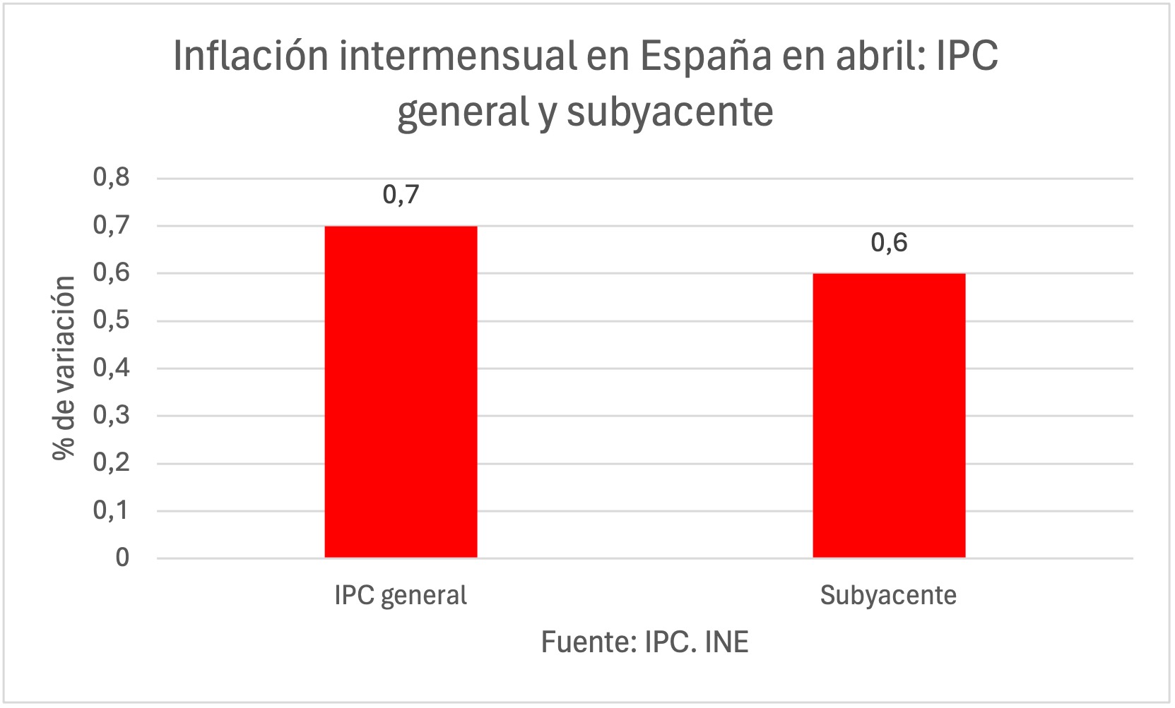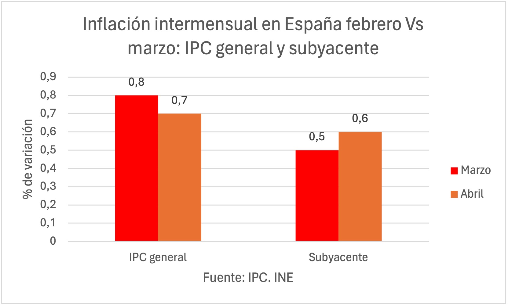 Esto supone una aceleración también en la tasa mensual de la subyacente, pues venía de un 0,5% intermensual, mientras que el IPC general pasa de un 0,8% intermensual en marzo a un 0,7% intermensual en abril, es decir, casi lo mismo, pero acumulando crecimientos cada vez mayores en términos mensuales, que aceleran la inflación (0,3% en febrero; 0,8% en marzo; 0,7% en abril).