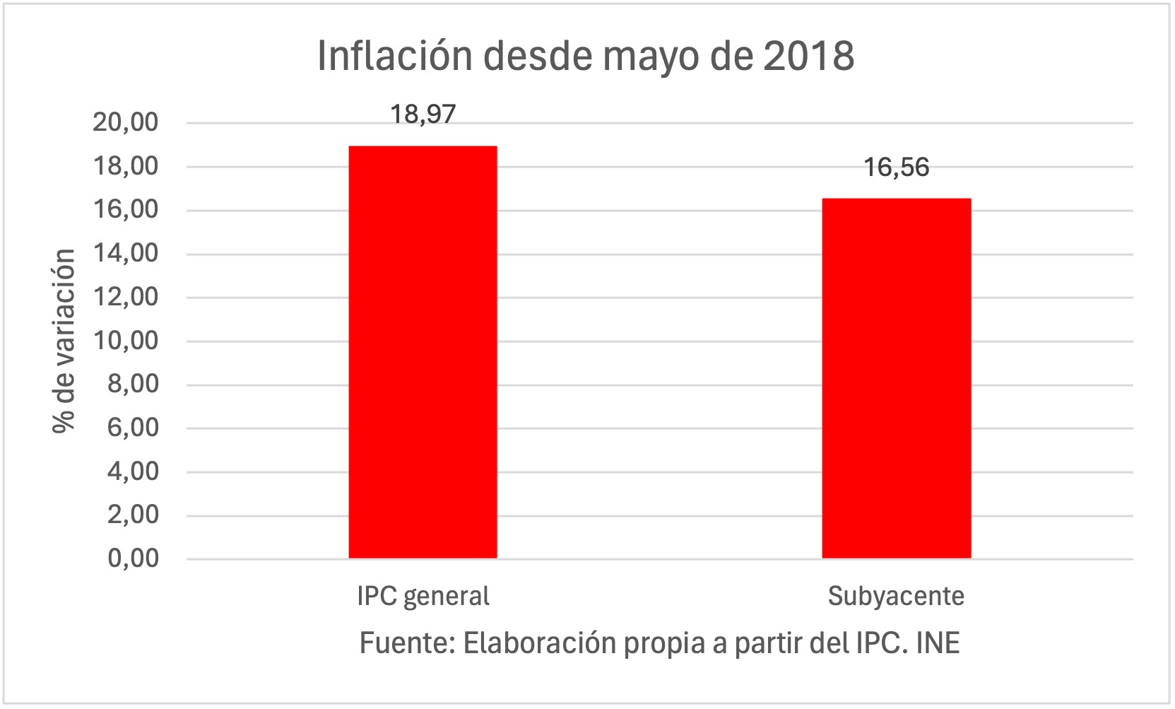 Todo ello, hace que desde que gobierna Sánchez la inflación haya subido un 18,97%, mientras que la subyacente, durante su mandato, lo haya hecho un 16,56%.