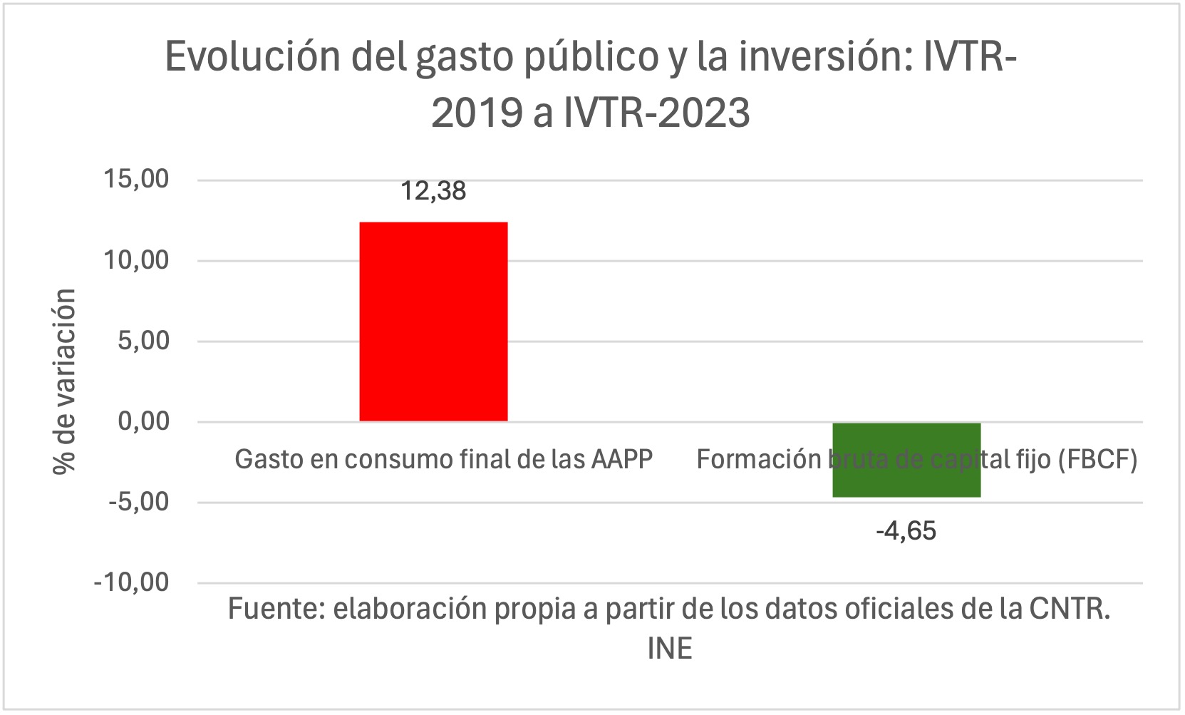 Además, la preocupante evolución del crecimiento económico, basado en el gasto público, elemento que lo impulsa pero que habrá de descender con las reglas fiscales, al estar ya operativas este año; y el turismo y el sector exterior, que se resentirán por la merma de renta de nuestros socios comerciales, que caen, no augura nada bueno. Un crecimiento en el que no dejan de crecer los costes laborales, de manera sostenida, y de caer la productividad, que nos hará perder mercados. Y un crecimiento del que ha sido expulsado, en gran parte, la inversión, con el consumo, además, en atonía (desde el IVTR-2019 hasta el IVTR-2023, al comparar años completos, la inversión caía casi un 5% frente al aumento de más de un 12% del gasto público; incluso con los datos del ITR-2024, la inversión sigue por debajo del nivel anterior a la pandemia). Todo muy preocupante.