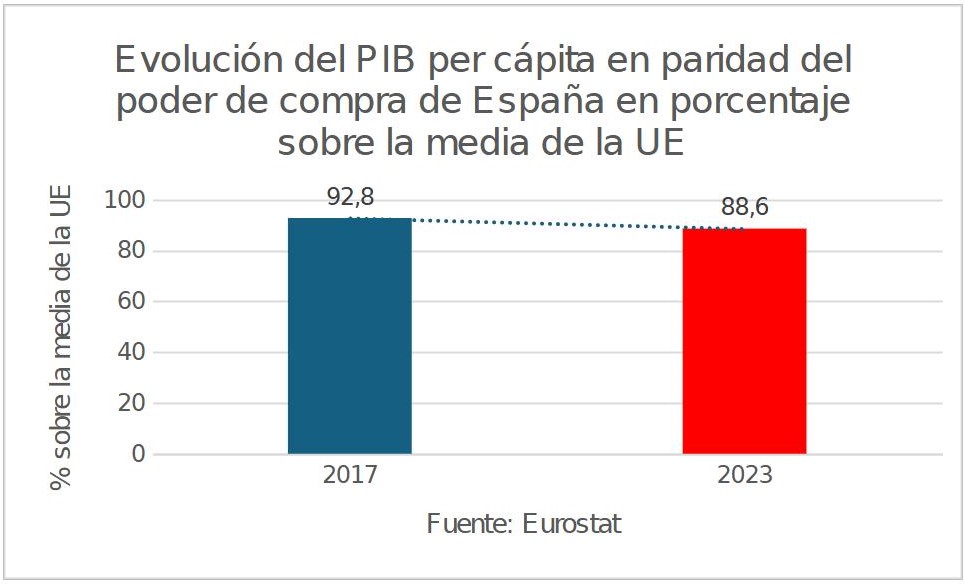 Es decir, España ha perdido 4,2 puntos en su convergencia con la UE y ha vuelto a instalarse entre los países pobres de la UE, que son aquellos con un PIB per cápita en paridad del poder de compra inferior a ese 90% de la media de la UE.