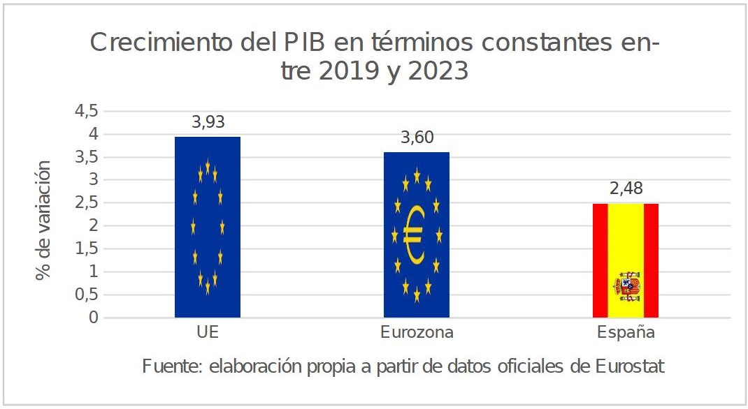 Por otra parte, en los últimos cuatro años, entre 2019 y 2023, es decir, casi todo el mandato de Sánchez, contra la propaganda gubernamental que afirma que somos quienes más crecemos en la UE, la realidad es bien distinta: mientras que la UE creció en ese período un 3,93% y la UE lo hizo un 3,60%, España creció un 2,48%, todo ello en PIB en términos constantes, tal y como se puede calcular a partir de los datos de los índices de volumen publicados por Eurostat.