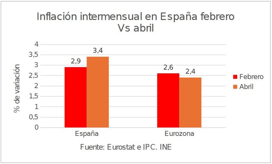 En cuanto a la inflación se acelera en España frente a la desaceleración en la media de la UE. Eso se ha visto en cuanto han retirado las subvenciones que tapaban el alza de los precios. Nos aleja del comportamiento de la eurozona, como muestran los últimos datos de inflación definitivos, que son los de abril, a la espera de que se confirmen los de mayo.