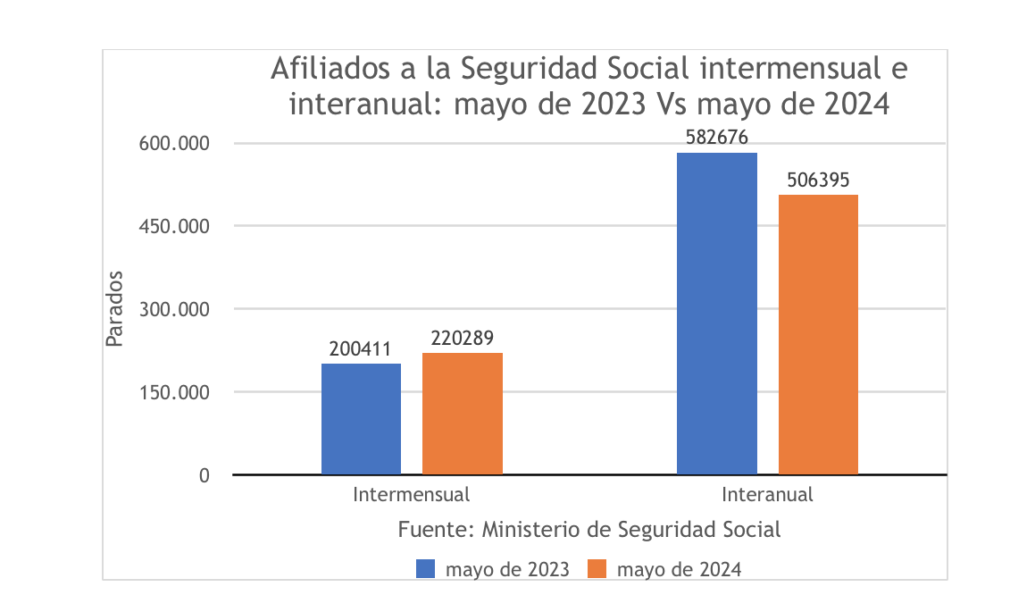 El número de afiliados interanual aumenta en 506.395 afiliados. Este registro es el tercero peor de un mes de mayo de los últimos diez años (el segundo si no incluimos el año de la pandemia, 2020). Y esa tasa interanual crece un 13% menos que en el mismo mes del año pasado.