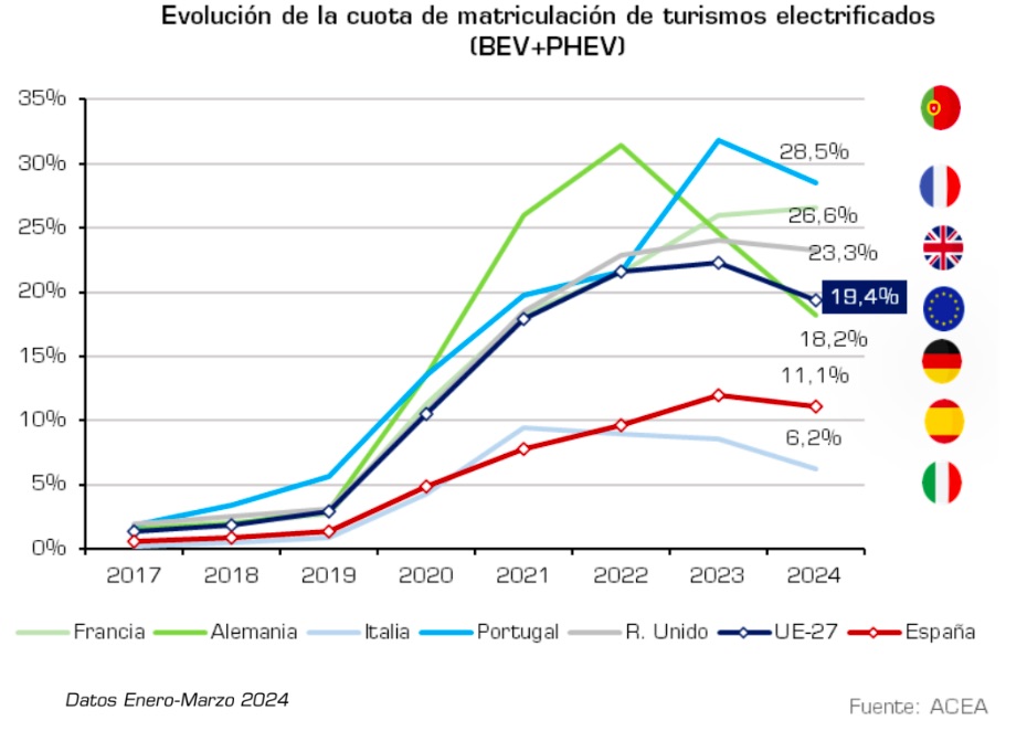 Un elocuente gráfico de Anfac refleja cómo España sigue lejos de la cuota de vehículos electrificados de países vecinos, con un 11,1 por ciento frente al casi 20 por ciento de la UE y cifras superiores de Reino Unido, Portugal y Alemania.