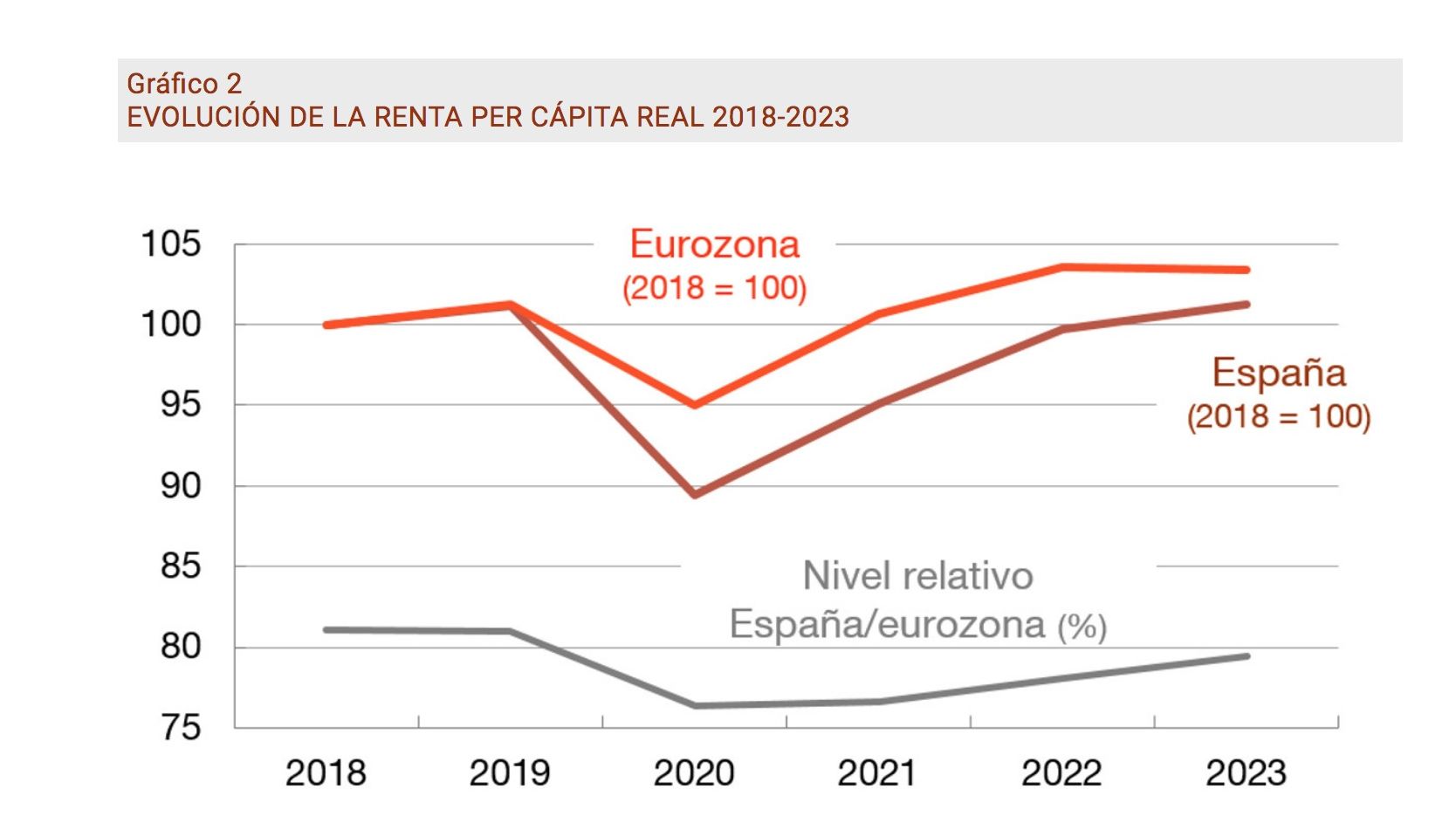Ayer lunes, Hernández de Cos publicó una carta de despedida tras "seis intensos años al frente del Banco de España". Estos años "han estado marcados por la sucesión de acontecimientos inauditos, como la pandemia, y los vaivenes de la economía y de la inflación" repasaba De Cos. El banquero también aprovechaba la misiva para hacer una preocupante advertencia sobre la economía española. "Europa se está quedando atrás con respecto al resto de grandes economías y España lleva ya más de una década sin conseguir converger de modo sostenido en renta per cápita con el resto de nuestros socios europeos" lamentaba adjuntando un gráfico que muestra el problema.