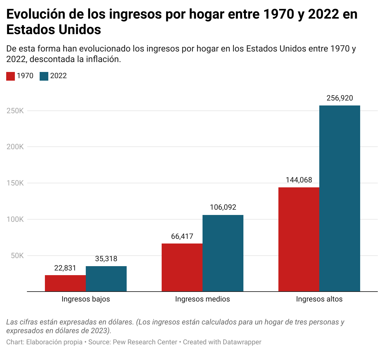 Tal y como se observa en el gráfico, los hogares de ingresos más bajos han pasado de tener ingresos de 22.831 dólares a tener ingresos de 35.318 dólares, los hogares de ingresos medios han pasado de 66.417 a 106.092 dólares, y los hogares de ingresos altos han pasado de 144.068 a 256.920 dólares. Es decir, los ingresos reales de todos los hogares han aumentado en estos últimos 50 años. El mismo periodo de tiempo en el que un 8% de la población ha pasado de pertenecer al nivel de ingresos medios a pertenecer al de ingresos altos.