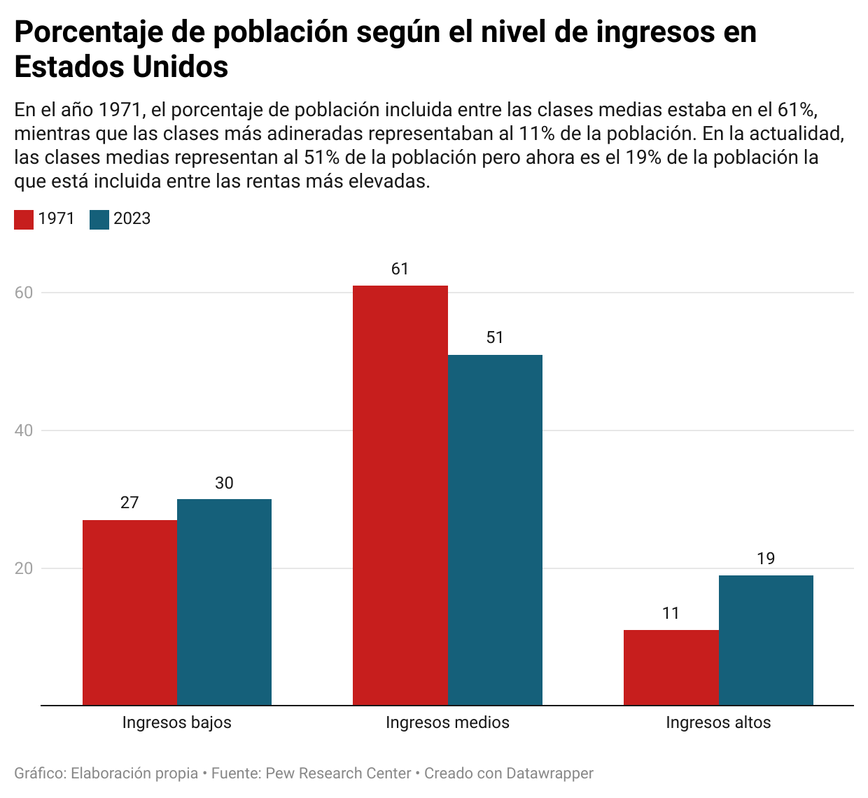 Según el Pew Research Center, en el año 1971, el porcentaje de población que estaba incluida en el rango de ingresos más bajos era del 27%, mientras el 61% de la población se incluía en el rango de ingresos medios y el 11% se situaba en el grupo de rentas más altas. Si observamos la situación actual vemos que se han producido una serie de cambios, a saber: el 30% de la población se sitúa en el grupo de ingresos más bajos, el 51% se incluye en el grupo de ingresos medios y el 19% pertenece al grupo de mayores ingresos.