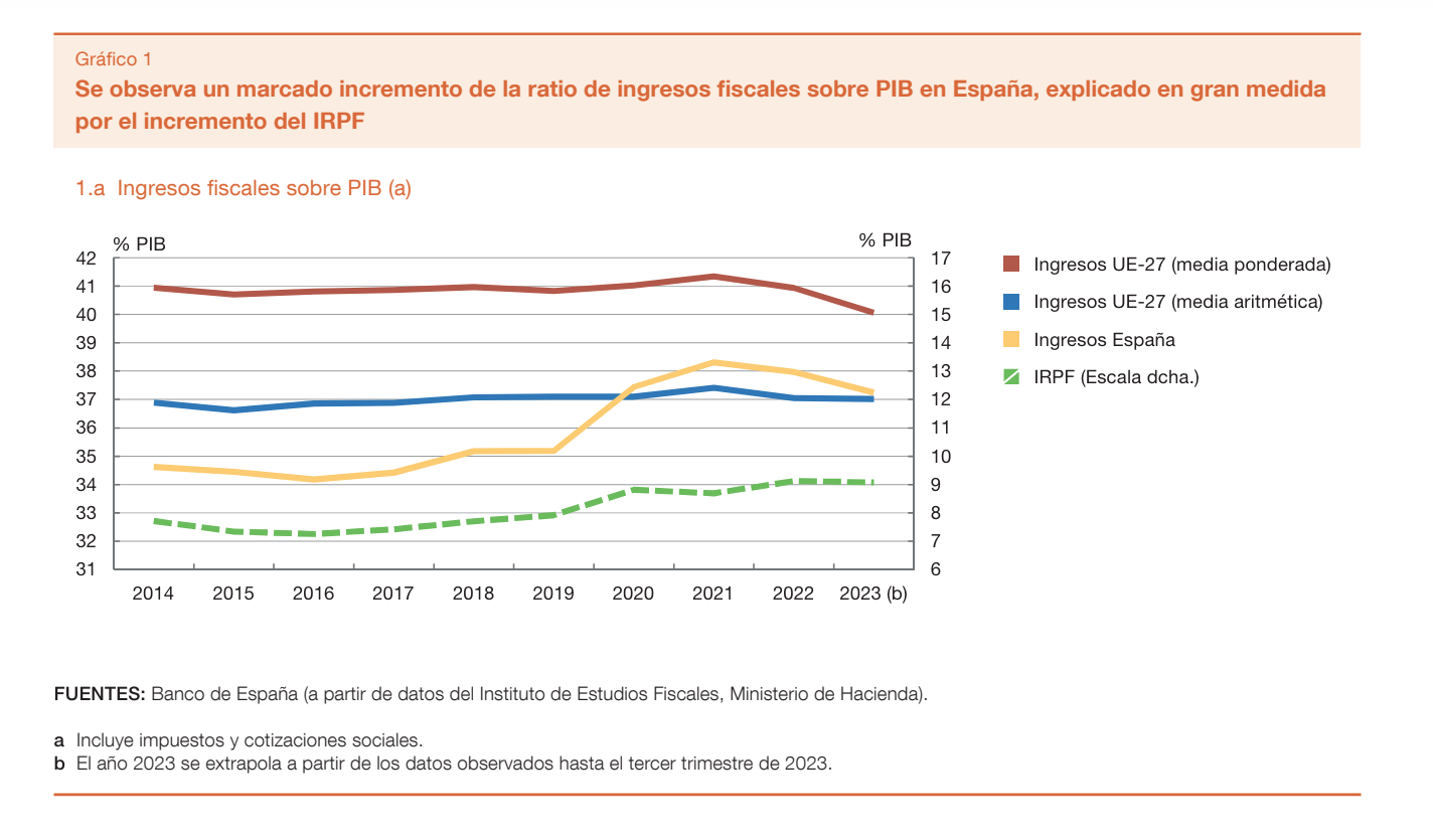 Pues bien, según el informe que ahora publica el Banco de España, si se analiza la evolución de dicho impuesto entre 2019 y 2023, se puede constatar que ha sido la falta de actualización de los umbrales de referencia del IRPF lo que ha contribuido más directamente a que la ratio de ingresos tributarios sobre PIB de España se acerque a los niveles europeos, consolidando así el proceso de "armonización fiscal" que siempre ha defendido la izquierda política y mediática de nuestro país.