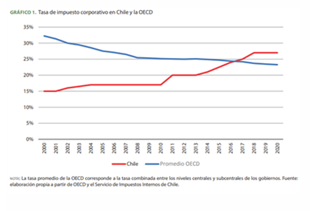 En el siguiente gráfico se puede comprobar cómo Chile pasó de tener una tributación empresarial un 50% menor que el promedio de la OCDE a situarse por encima de dicha media, con el agravante de que la tendencia de Chile es alcista y la de la OCDE, bajista: