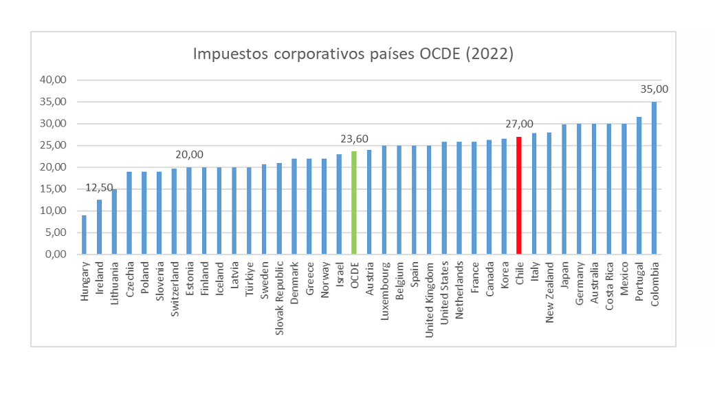 Así, aunque el tipo medio del Impuesto de Sociedades asciende al 23,6%, Chile aplica un 27%. Resulta llamativo, además, que la fiscalidad empresarial sea más dura en uno de los países de la OCDE con menor nivel de renta, puesto que el esfuerzo fiscal resultante es mucho mayor (dicho de otro modo, no es lo mismo cobrar un 27% en Chile que un 30% en Japón, puesto que el país nipón parte de niveles de desarrollo más altos y, además, ha mantenido el tipo estable en las últimas décadas).