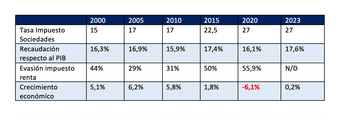 El experto señala que "pasando del 15% al 27%, y eliminando deducciones y exenciones, el Impuesto de Sociedades apenas ha mejorado su recaudación del 15-16% al 16-17%. Además, las tasas de evasión han aumentado en nueve puntos porcentuales. Durante este periodo, de subidas impositivas, el crecimiento ha caído de una horquilla del 5-6% a niveles que apenas superan el 0% en 2023". Siendo exactos, la subida habrá sido de apenas un 0,2%.