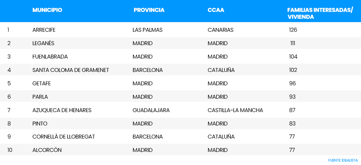En la localidad madrileña de Leganés, se registran 111 candidatos por anuncio; en Fuenlabrada, 104 y en Santa Coloma de Gramanet, en Barcelona, una media de 102. Juntos a otros municipios de Madrid y Cataluña, en el Top 10 se encuentra también un municipio manchego: Azuqueca de Henares, en Guadalajara, donde cada vivienda recibe hasta 87 solicitudes.