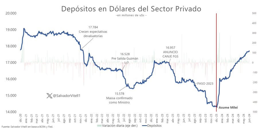 En la misma línea, el analista Salvador Vitell, jefe de investigación del Grupo Romano, ha divulgado un interesante análisis de la capacidad de ahorro de las familias argentinas. El gráfico siguiente muestra que los depósitos en dólares del sector privado cayeron a plomo entre 2021 y 2023, al pasar de más de 19.000 millones de dólares a poco más de 14.000 millones.