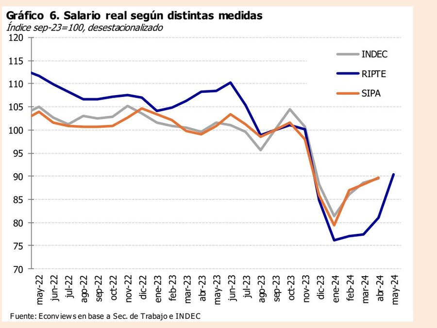 Hay, asimismo, una tercera barra en el gráfico, de color azul, que presenta datos hasta el pasado mes de mayo. En este caso, la fuente es la serie estadística de Remuneración Imponible Promedio de los Trabajadores, una estadística que también facilita el SIPA. Como puede verse, este indicador muestra una recuperación muy similar, si bien su punto de partida era mayor, de modo que la caída acumulada antes de la llegada al gobierno de Javier Milei será más intensa aún que la derivada del INDEC y el SIPA.