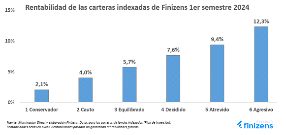 Finizens, el gestor automatizado de inversiones ("robo advisor") especializado en carteras de fondos indexados y planes de pensiones indexados termina el primer semestre del 2024 con rentabilidades netas medias del +7,6%, que van desde el +2,1% obtenido para su cartera 1 (perfil conservador) hasta el +12,3% de su cartera 6 (perfil agresivo).