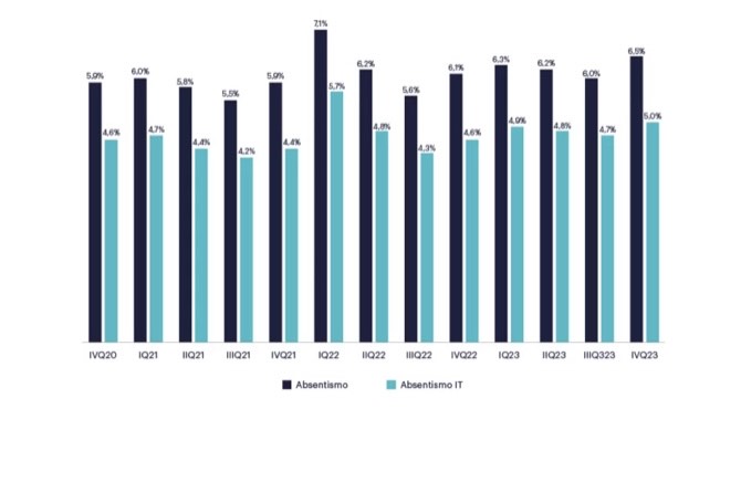 Por otro lado, los datos de Randstad Research revelan que el absentismo laboral en el cuarto trimestre de 2023 provocó la pérdida del 6,5% de las horas pactadas, con un absentismo por IT del 5%. En promedio, 1,4 millones de personas no acudieron a su trabajo diariamente, de las cuales 1,07 millones estaban de baja médica.