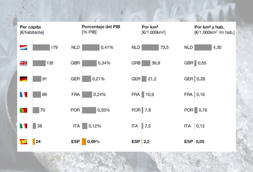 España ha sido históricamente uno de los países que menos invierten en el ciclo del agua, a excepción de los años 2006 y 2007 donde hubo un récord de inversiones. Esta tendencia ha continuado incluso pese a la contracción de inversiones en otros países desde 2008. El informe de PwC destaca que la inversión en infraestructuras hídricas en relación con el PIB es de las más bajas de la Unión Europea. Mientras que la media en la UE representa aproximadamente el 0.40% del PIB, España invierte solo el 0.09%. Este porcentaje es menor en comparación con países como Países Bajos (0.41%), Portugal (0.33%), Francia (0.24%) y Alemania (0.21%), reflejando una clara desventaja competitiva y una falta de prioridad en la gestión de recursos hídricos.