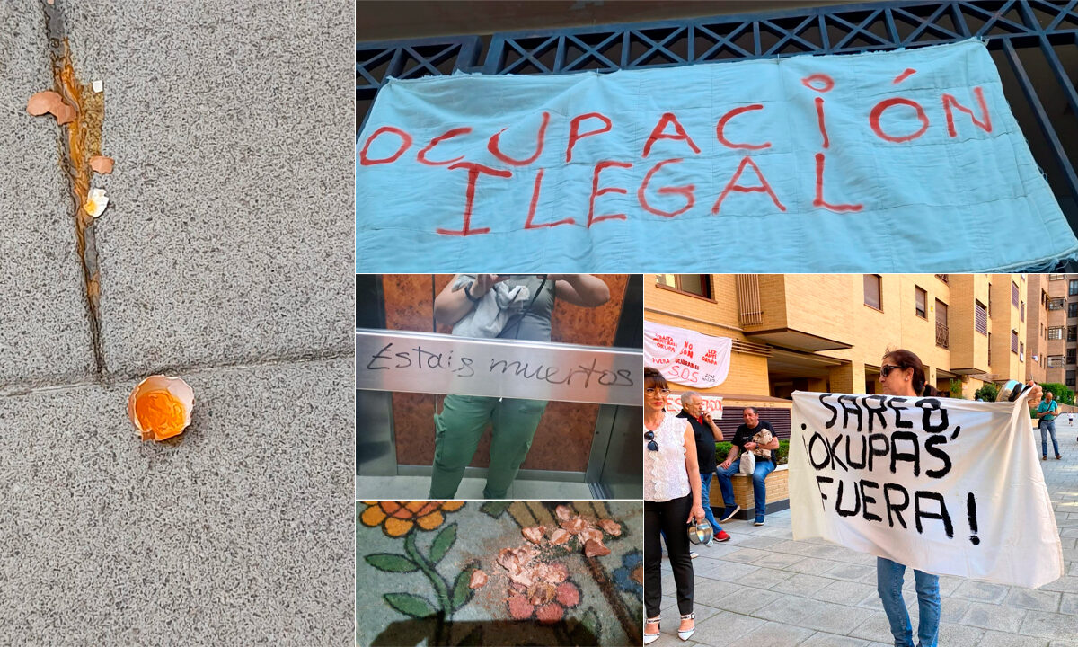 La situación es tan desesperante que, tal y como relata Pilar, "un matrimonio mayor no ha tenido más remedio que irse porque ya no aguantaban más, otras dos vecinas están en tratamiento psicológico y una se ha tenido que ir al pueblo por la presión". Desde hace tres años, las amenazas son constantes, pero desde que decidieron salir a los medios a denunciar la situación, el acoso se ha incrementado. A las pintadas de "hijos de puta, estáis muertos" que aparecieron en el ascensor, se suma el lanzamiento de huevos y hasta de carne podrida, tal y como muestran las fotografías que la propia presidenta nos envía de la puerta de su propia casa.