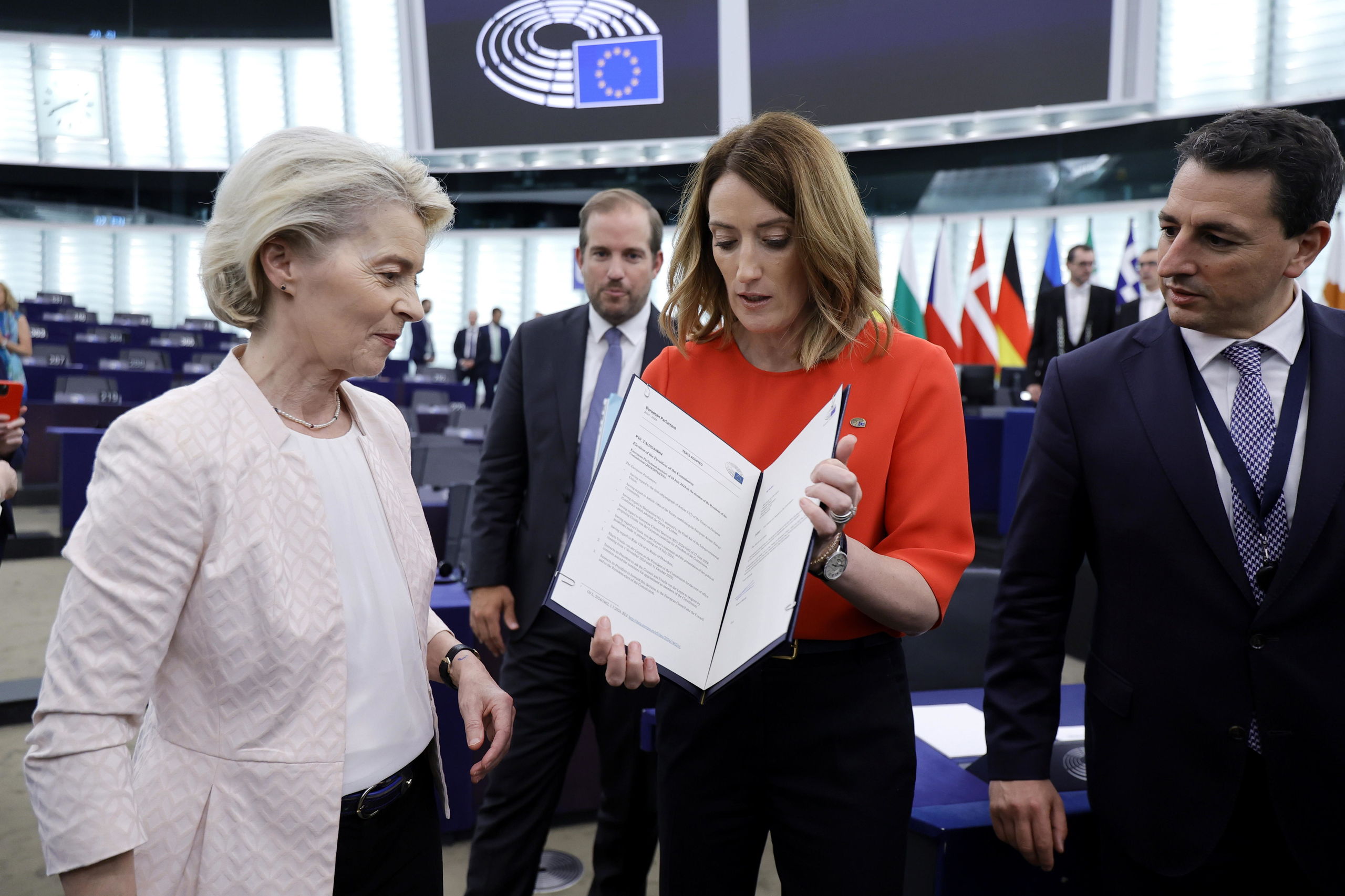 La jefa del Ejecutivo comunitario consiguió repetir la coalición compuesta por populares, socialistas y liberales que ya respaldó su candidatura en 2019, que juntos suman 401 escaños, además de ganar el apoyo de los verdes, que a última hora han decidido votar por Von der Leyen pese a rebajar sus reclamaciones ambientales.