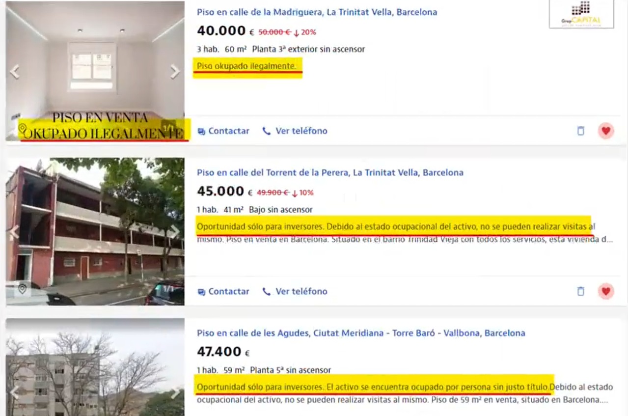 "Oportunidad solo para inversores. Piso okupado ilegalmente", rezan la mayor parte de los anuncios. "El activo se encuentra ocupado por persona sin justo título y sin los suministros debidamente contratados", añaden otros. A cambio, eso sí, es fácil encontrar auténticas gangas, incluso en barrios como el de San Andrés, "un distrito donde se funde el carácter más moderno e innovador del municipio de Barcelona", como presume uno de los vendedores, que ofrece un piso de dos habitaciones por 47.800 euros.