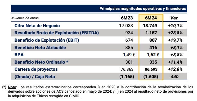 ACS obtuvo un beneficio neto de 416 millones de euros en los seis primeros meses del año, lo que supone un incremento del 8,1% respecto al mismo periodo del año anterior, gracias a la buena evolución operativa de todas sus actividades, especialmente su filial Turner de Estados Unidos. También gracias a la incorporación de la empresa de servicios de minería australiana Thiess tras la adquisición de un 10% el pasado mes de abril. El beneficio por acción (BPA) ha crecido un 8,8% hasta alcanzar los 1,62 euros.