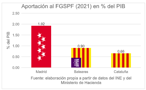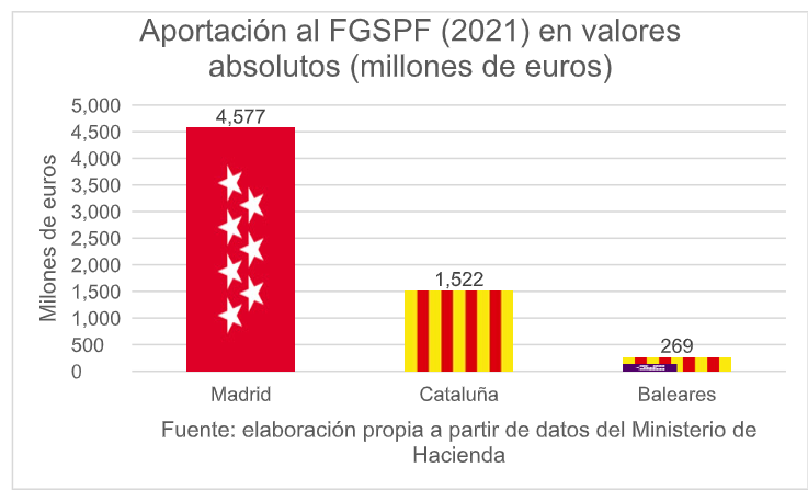 Para llegar a los 1.522 de la aportación de Cataluña al FGSPF, restan 392 millones, que aportan entre Madrid y Baleares, en el peso que suponen sobre la parte regional del fondo sumando ambas (4.577+269= 4.846). Eso es un peso de Madrid del 94%, con lo cual sufraga 368 millones (alrededor de 350 según el año, horquilla entre 330 y 370 millones). Baleares sufraga el resto (24 millones).