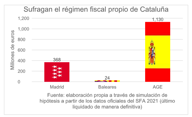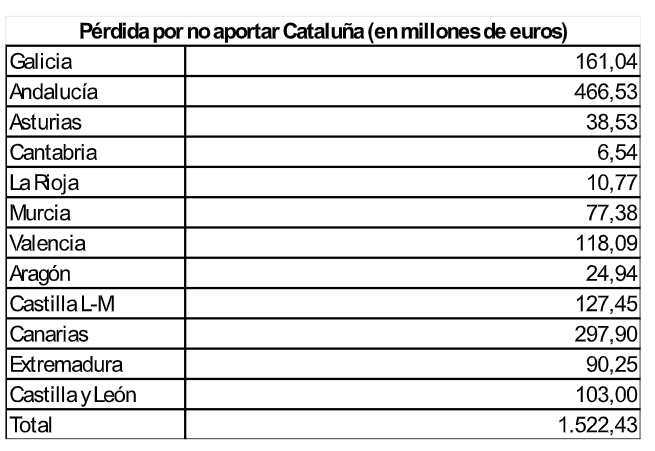En este caso, Madrid y Baleares aportan los 1.522 millones que deja de aportar Cataluña, con el peso antes citado, un 94% para Madrid, que son 1.432 millones, y Baleares con 90 millones.
