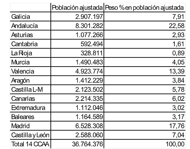La población ajustada de las otras catorce regiones de régimen común es la siguiente: