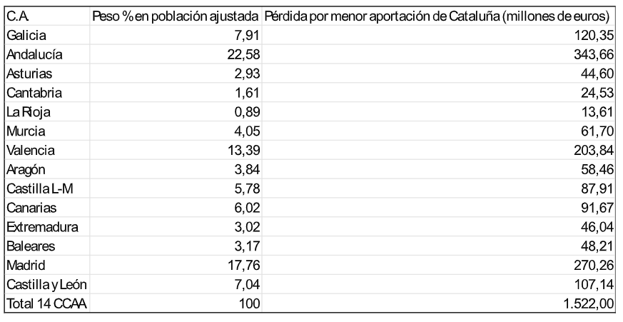 3. La parte neta que dejaría de aportar Cataluña es asumida como menores ingresos por todas las CCAA de régimen común en función al porcentaje de participación en el fondo (por población ajustada).