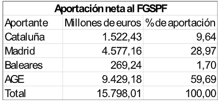 Cataluña, en 2021, último liquidado, aportó de manera neta el 9,64% del FGSPF, con esos 1.522 millones de euros. Madrid aportó un 28,97%, con 4.577 millones. Baleares aportó un 1,70%, con 269 millones. La AGE aportó un 59,69%, con 9.429 millones.