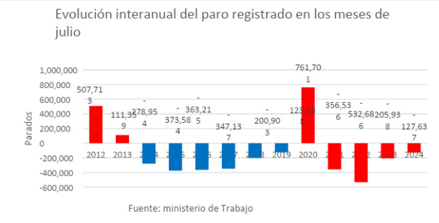 Por otra parte, en tasa interanual baja en 127.637 personas, que es el tercer peor dato interanual de un mes de julio de los últimos once años (el segundo, sin contar 2020, cuando operaban las restricciones por la pandemia), con lo que la bajada no es especialmente destacable para este mes, hecho que muestra la ralentización interanual de la bajada del paro, comparando períodos homogéneos.
