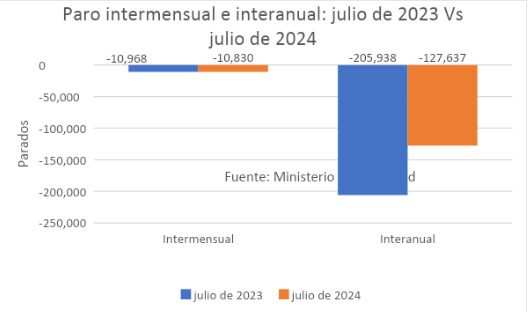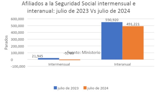 El empleo se destruye este mes, con el descenso de afiliados a la Seguridad Social, después de que el que se hubiese creado en los últimos meses no fuese sólido, porque no se creaba, sino que se repartía, pero este mes, además, se destruye empleo. Adicionalmente, el último día de mes se destruyeron 176.258 puestos de trabajo. De hecho, en términos interanuales se desacelera de manera importante, siendo el cuarto peor dato interanual de un mes de julio de los últimos once años.