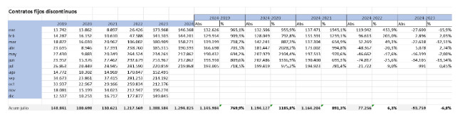 En 2022 hubo, al menos, un artificio de más de un millón y medio de este tipo de contratos acumulado en el año, con muchos trabajadores que firman varios contratos indefinidos a lo largo del mes al haberse prohibido la contratación temporal y no optar algunas empresas por la figura del fijo-discontinuo, sino por breves contratos indefinidos. En enero, febrero y marzo de 2023, prosiguió el efecto del artificio normativo, que empezó a corregirse, por comparación estadística, en abril de 2023 y continúa, por los mismos motivos, desde entonces.
