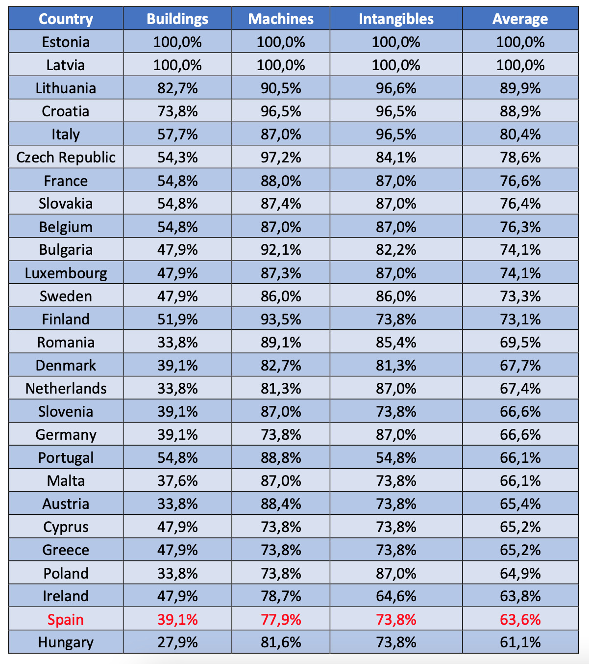 En las inversiones dedicadas a la adquisición de suelo (edificios, fábricas, etc.), el tratamiento tributario promedio asignado por los países miembros de la UE permite recuperar el 51,3% del dinero dedicado a estas compras. Tales inversiones gozan de una deducibilidad del 100% en Estonia y Letonia, frente al magro 39,1% que se permite en España. El promedio europeo está en el 51,3% y también se destacan por encima del mismo países como Lituania (82,7%) o Croacia (73,8%). Francia permite recuperar el 54,8% y Alemania, el mismo porcentaje que nuestro país (39,1%). Italia y Portugal se anotan un 57,7% y un 54,8%, respectivamente.