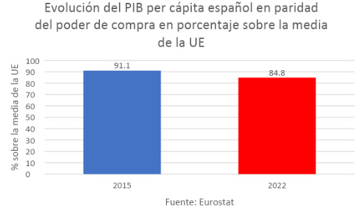 Y paralelamente en dicho período, ¿qué ha pasado desde el punto de vista de la prosperidad española? Que España no ha dejado de retroceder en PIB per cápita en paridad del poder de compra respecto de la media de la UE, al pasar del 91,1% de 2015 al 84,8% en 2022.
