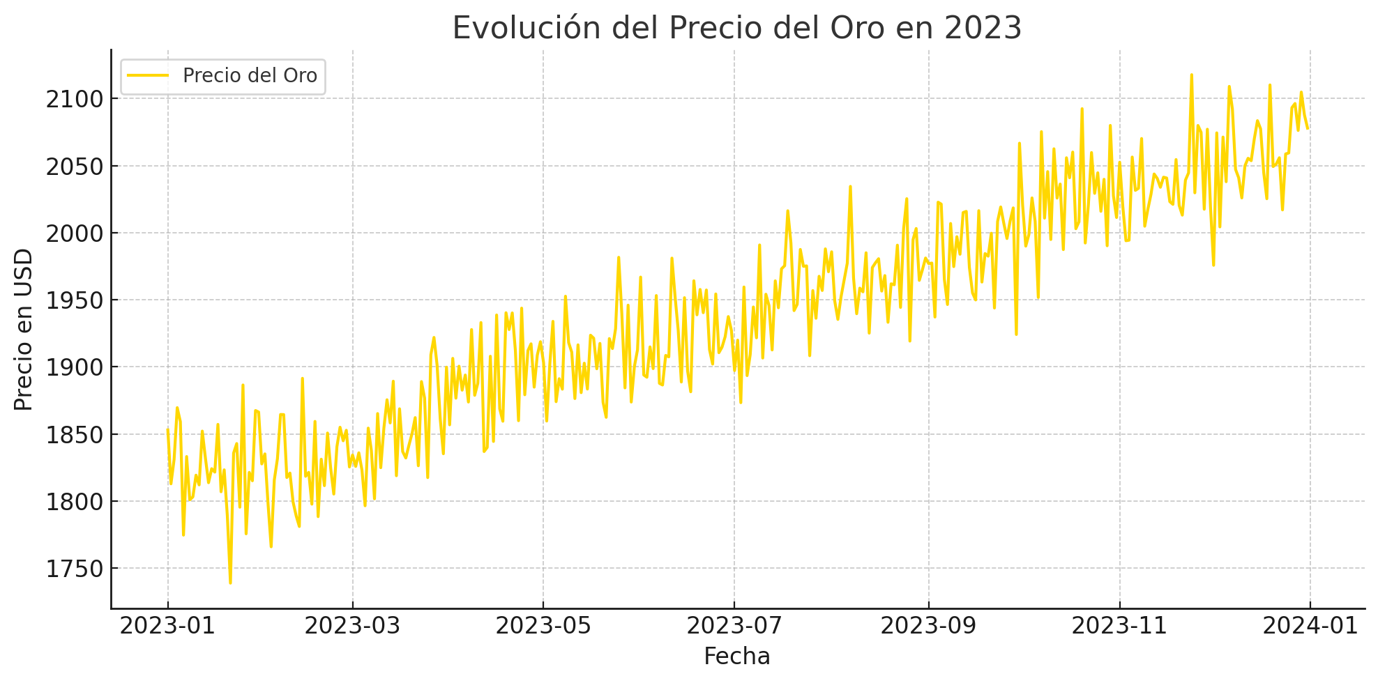 En 2023, la cotización del oro comenzó el año en torno a los $1,800 por onza y cerró en un récord de $2,078.40 por onza al final del año.