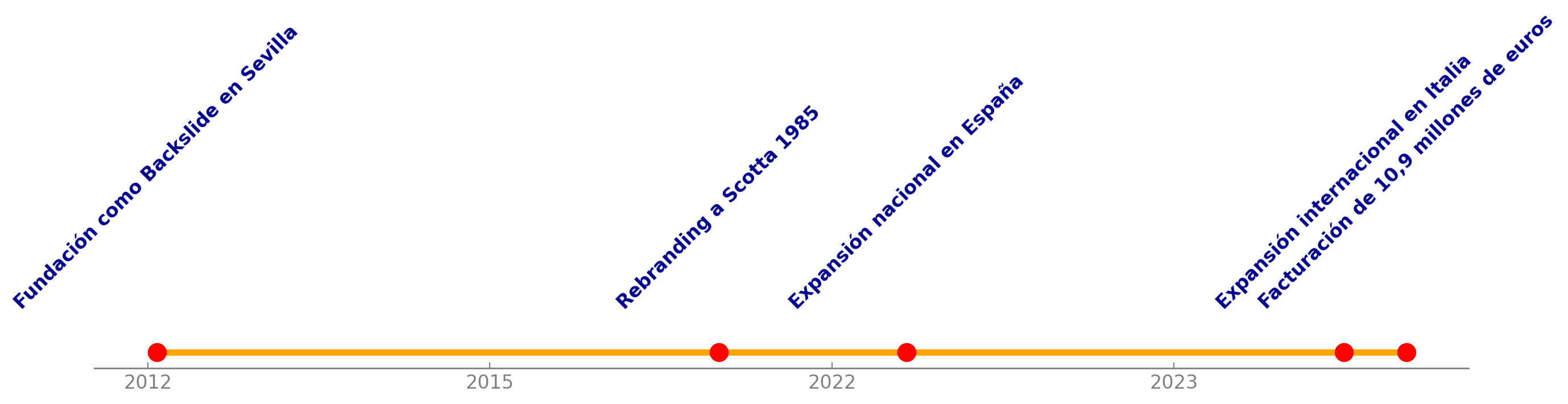 Una de las decisiones más significativas en la evolución de la marca fue el cambio de nombre de Backslide a Scotta 1985 en 2012. Este rebranding no fue simplemente un cambio de nombre; representó una estrategia integral para reflejar la madurez de la marca y su expansión hacia un público más amplio. El nombre "Scotta 1985" fue elegido por su resonancia simbólica, buscando transmitir solidez y tradición, aunque 1985 no es el año de fundación de la empresa, sino un año seleccionado para simbolizar un momento de transformación y crecimiento.