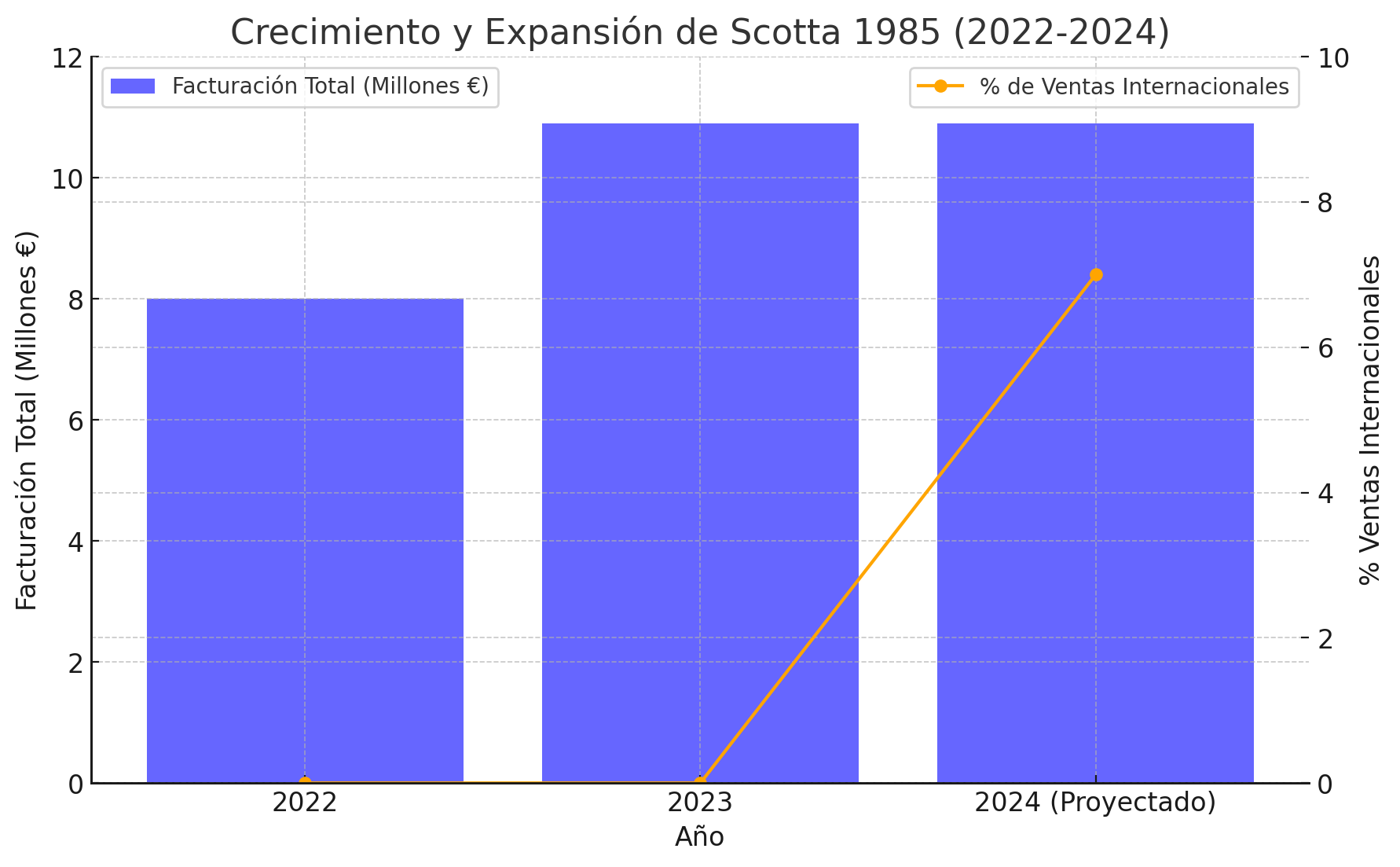 El plan de expansión internacional ha sido clave para impulsar las ventas, aunque el mercado internacional todavía representa un porcentaje menor en el total de los ingresos de Scotta 1985. Para 2024, la compañía tiene como objetivo incrementar el peso de su mercado internacional hasta alcanzar el 7% de su facturación total, lo que equivaldría a unos 900.000 euros en ventas fuera de España.
