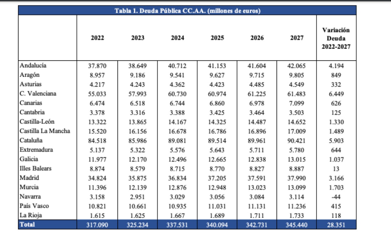 En la tabla anterior se observa que Cataluña era, con diferencia, la comunidad autónoma con el mayor volumen de deuda de España en 2022 (84.5183 millones) y que lo seguirá siendo en 2027, cuando habrá aumentado su deuda hasta los 90.421 millones de euros.