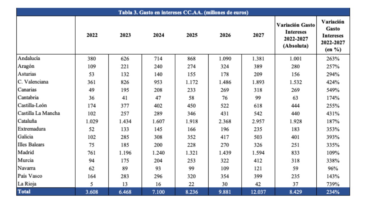 Así, si en 2022 el gasto total autonómico en intereses ascendió a 3.608 millones de euros, Fedea estima que esa cifra se incrementaría hasta los 12.037 millones de euros en 2027. Esto significa multiplicar por 3,3 los recursos que se dedicaron en 2022 a satisfacer los gastos financieros de la deuda pública autonómica.