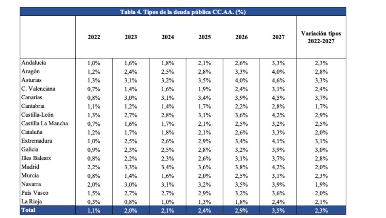 Respecto al tipo medio de la deuda pública autonómica (definido como el cociente entre el pago anual de intereses y el stock de deuda pública a cierre del año), Fedea señala que fue del 1,1% en 2022 y ascenderá hasta el 3,5% en 2027. "Esto significa un coste de más del triple del actualmente vigente. Destaca el aumento de los tipos por encima del 4% de: Asturias, Canarias, Castilla y León y Madrid" señalan.