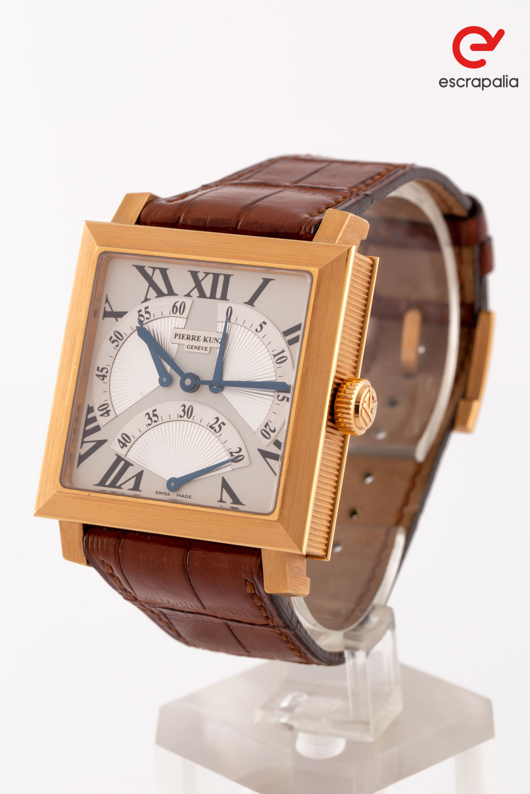 Reloj Pierre Kunz Genève de oro de 18 quilates y forma cuadrada. El fondo es transparente, mostrando el movimiento. La correa está levemente desgastada, pero es la original. La puja supera actualmente los 1.600 euros.