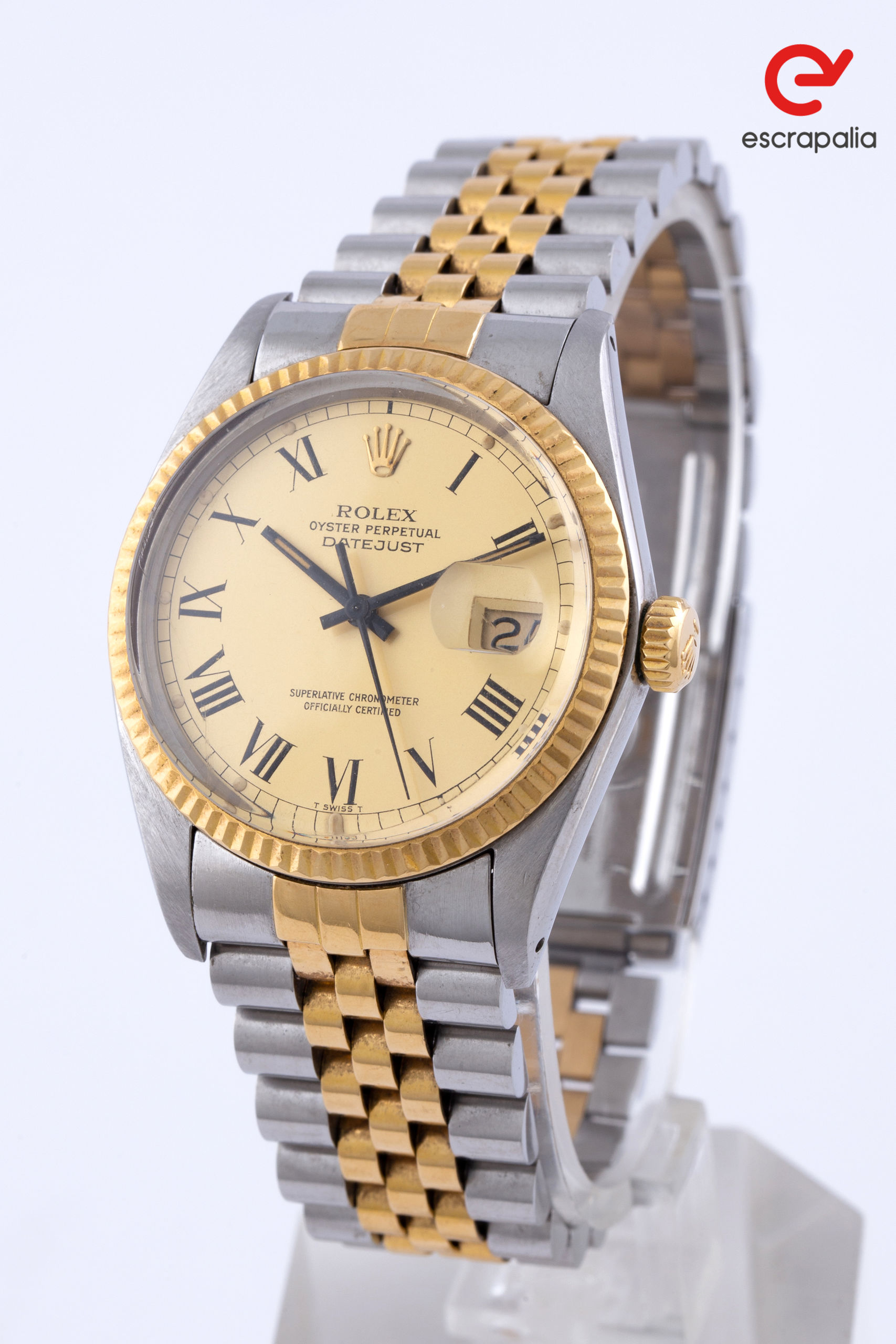 El rejol Rolex Oyster Perpetual Datejust es de acero inoxidable y oro amarillo de 18 quilates (Rolesor). El cristal, de zafiro resistente a arañazos, no presenta daños. La puja ya supera los 1.100 euros.