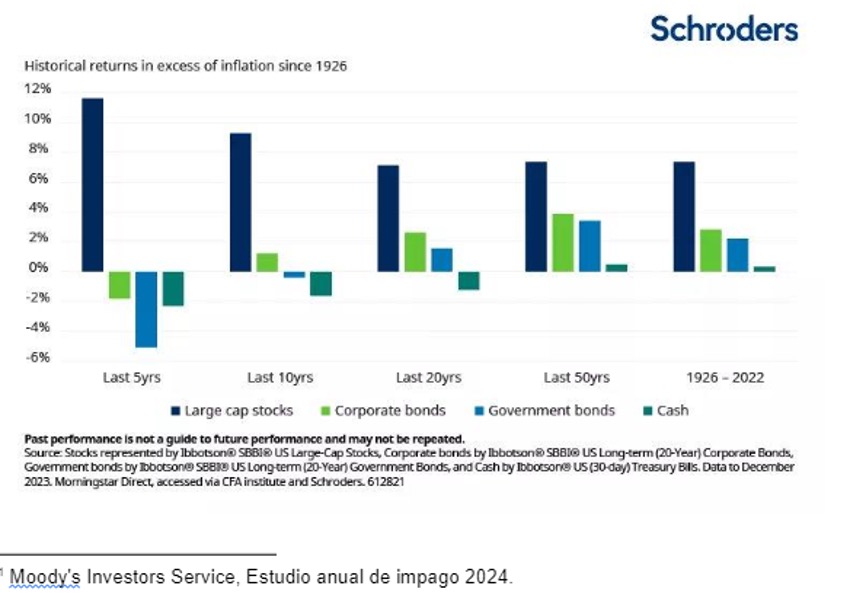 La renta variable ha ofrecido una rentabilidad superior a la inflación durante varios periodos históricos, ya sea en los últimos 5 años (alrededor del 12%) o 50 años (alrededor del 7%). En periodos más largos, como 20 o 50 años, los bonos también han ofrecido una rentabilidad superior a la inflación. Pero no ocurre lo mismo con periodos históricos más cortos, ya que en los últimos años los bonos se han visto afectados por el aumento de la inflación y la correspondiente subida de los tipos de interés. Dentro de los bonos, los bonos corporativos han tendido a batir a la inflación en mayor medida que los bonos gubernamentales.