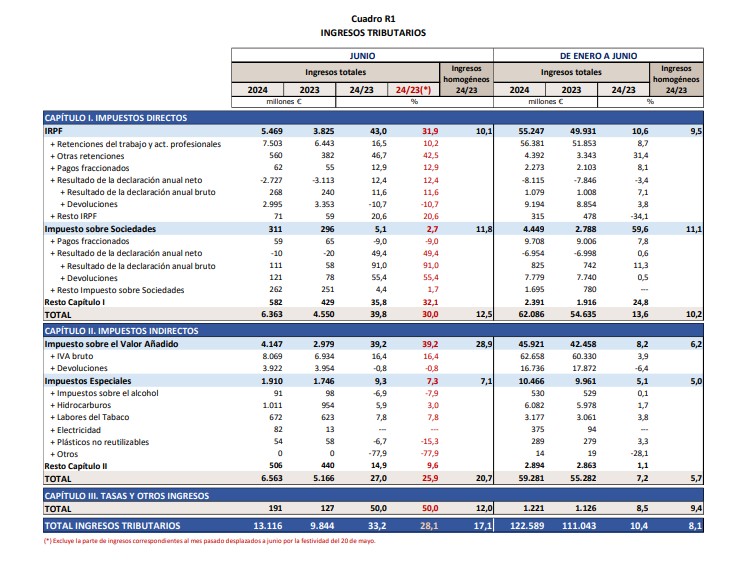 En lo que llevamos de 2024, el ejercicio también está teniendo muy buenos resultados para Hacienda. En concreto, hasta junio, último mes con los datos disponibles, las arcas del Estado se han llenado con 122.589 millones de euros.