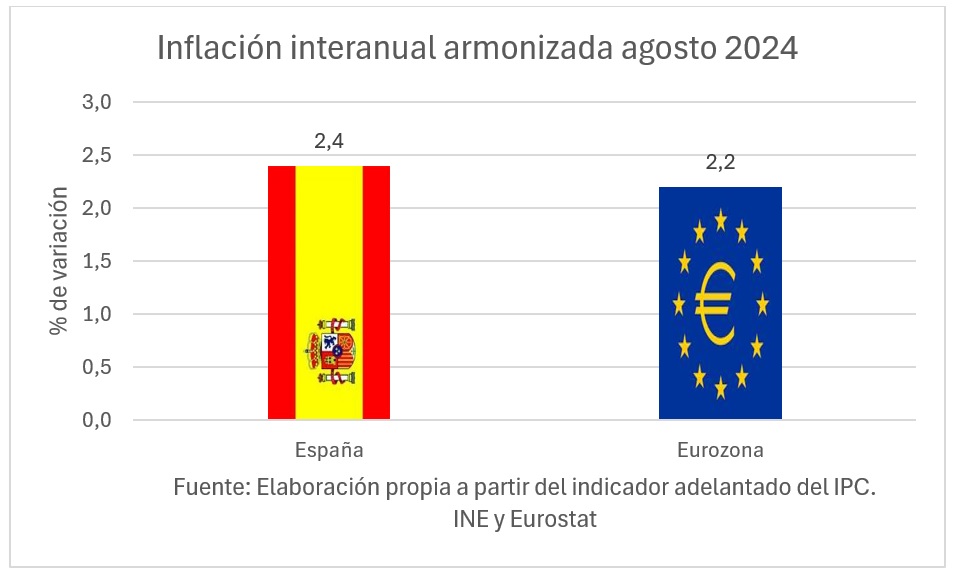 La inflación se mantiene en agosto todavía por encima del objetivo de precios del BCE, al situarse en el 2,2% interanual, tal y como ha anticipado el indicador adelantado del IPC de agosto. La subyacente también se sitúa en el 2,7% interanual, con fuerte resistencia a la baja, y el IPC armonizado con la UE en el 2,4% interanual, que es el homogéneo con el resto de la UE y sobre el que se basa el BCE como indicador de precios, que muestra que el nivel de precios está todavía en España un 20% por encima del objetivo del BCE para la eurozona (2%), frente al 2,2% de la media de la zona euro.