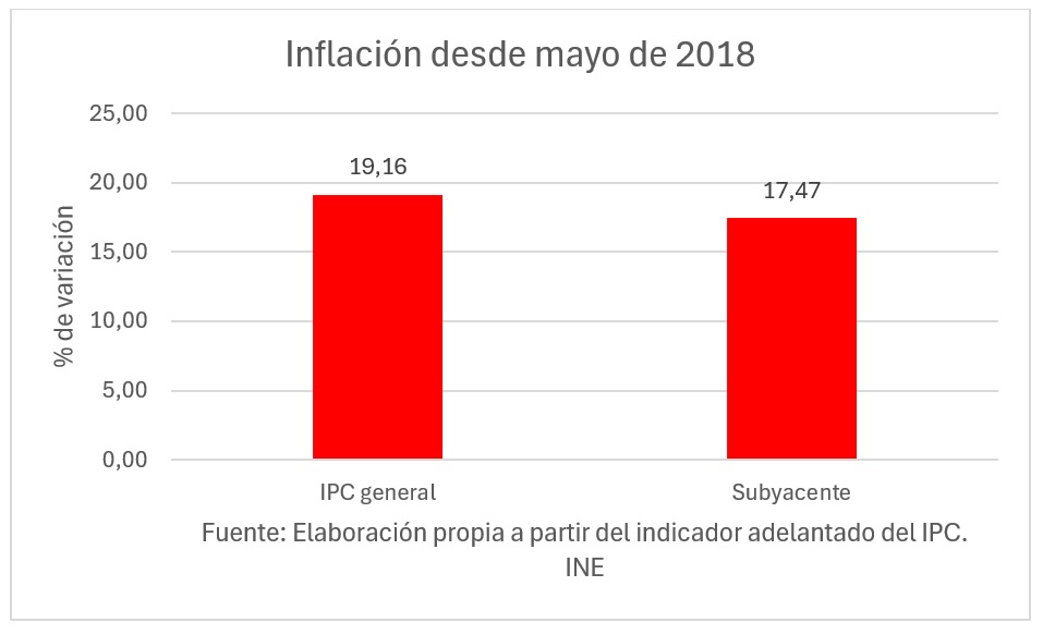Todo ello, hace que desde que gobierna Sánchez la inflación haya subido un 19,16%, mientras que la subyacente, durante su mandato, lo haya hecho un 17,47%.